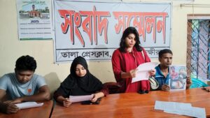 তালা প্রতিনিধি: সাতক্ষীরার তালা উপজেলার মদনপুর গ্রামে অবৈধভাবে বালু বিক্রয়কে কেন্দ্র করে সংঘর্ষে একই পরিবারের দুইজনসহ চারজন আহত হয়েছেন। এ ঘটনায় আহতদের পক্ষ থেকে সংবাদ সম্মেলন করে হামলাকারীদের দৃষ্টান্তমূলক শাস্তি দাবি করা হয়েছে। রোববার (১৩ অক্টোবর) বিকালে তালা প্রেসক্লাবে অনুষ্ঠিত সংবাদ সম্মেলনে ভুক্তভোগী পরিবারের সদস্য ঈশিকা আরজু লিখিত বক্তব্য পাঠ করেন।